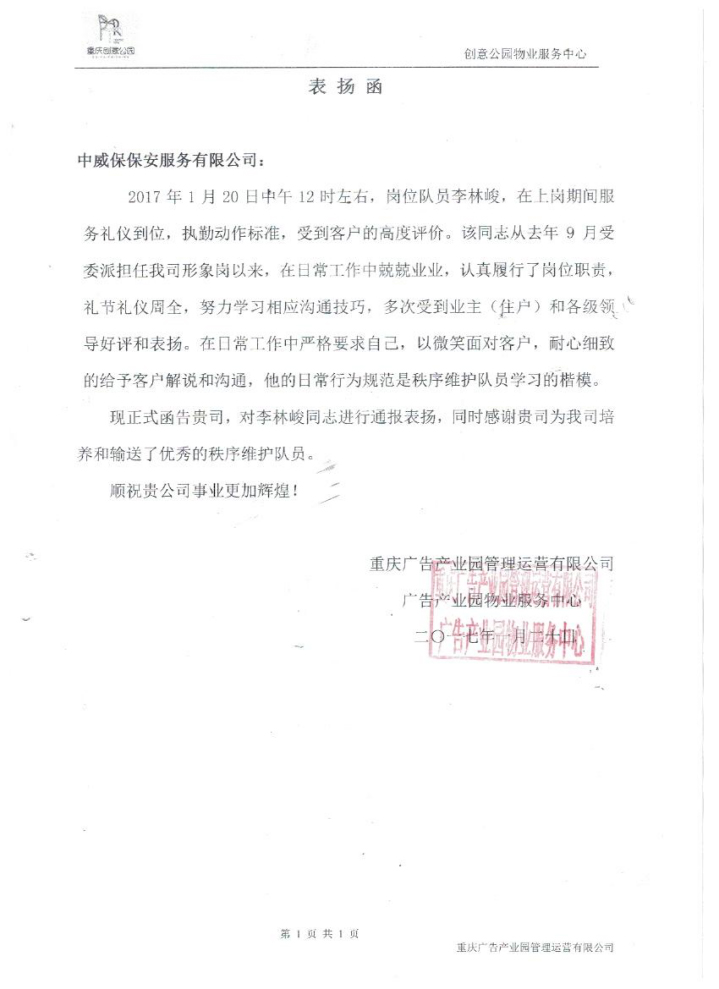 2017年1月20日,中威保保安服務(wù)公司收到了一封特殊的表揚(yáng)函。重慶廣告產(chǎn)業(yè)園管理運(yùn)營公司表揚(yáng)我司保安員李林峻,對他認(rèn)真負(fù)責(zé)的工作態(tài)度給予高度評價,希望能夠?qū)⑦@種認(rèn)真履職的精神和專業(yè)服務(wù)的工作態(tài)度精神發(fā)揚(yáng)光大。