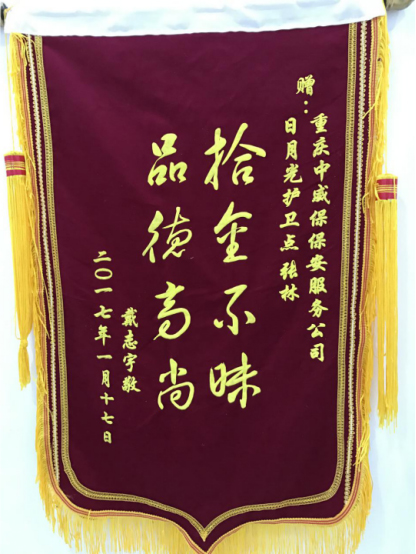 原來1月14日晚23點(diǎn)10分,中威戰(zhàn)士張林巡查至Bl層地鐵口時,拾得一部蘋果7。對于從事保安工作的張林來說,這樣一個手機(jī)的價值已經(jīng)是他幾個月工資了。第一次撿到如此貴重的手機(jī),張林的心中卻沒有絲毫猶豫,第一時間將此事上報給了保安隊(duì)長。經(jīng)過多方面的打探,找到了失主物歸原主。為表示感謝,失主特地制作了錦旗一面,感謝張林拾金不睞,感謝培養(yǎng)張林的中威保保安服務(wù)公司。