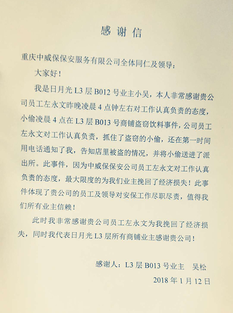 1月12號晚上凌晨4點(diǎn)左右,中威保駐日月光的巡邏隊(duì)員左永文發(fā)現(xiàn)盜竊商鋪的小偷后,在第一時(shí)間聯(lián)合其他幾名隊(duì)員將其扭送派出所,最大限度地為業(yè)主挽回了經(jīng)濟(jì)損失,中威保人認(rèn)真負(fù)責(zé)的工作態(tài)度再次得到了業(yè)主的贊揚(yáng)與情真意切的感謝。